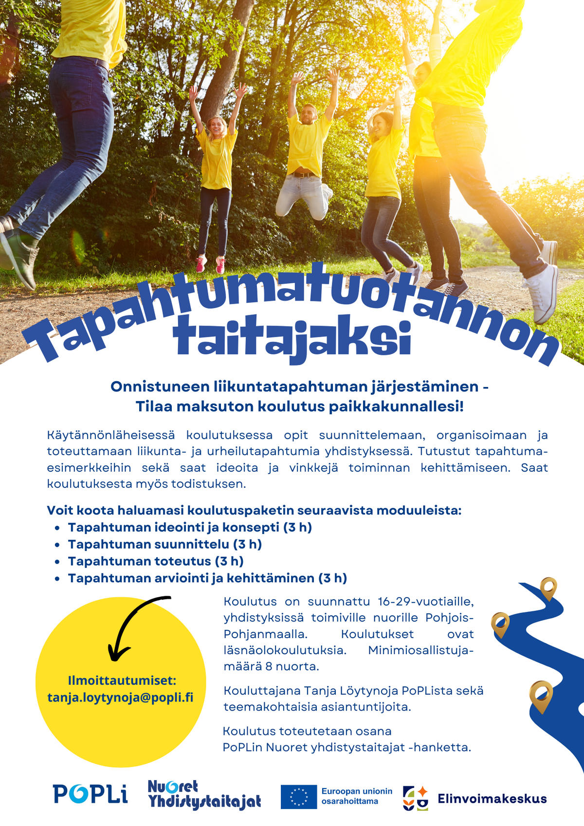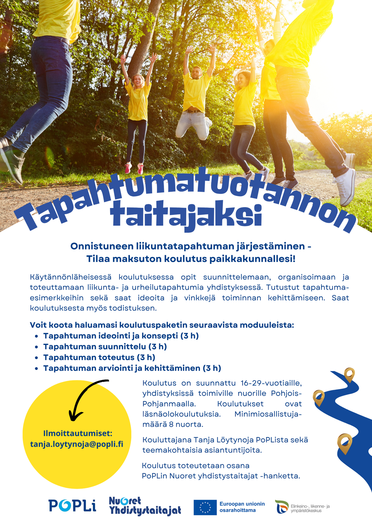 Onnistuneen liikuntatapahtuman järjestäminen -koulutus on suunnattu 16-29-vuotiaille nuorille. Kokoa nuorista minimissään kahdeksan hengen ryhmä ja ota yhteyttä Tanja Löytynojaan (etunimi.sukunimi@popli.fi), niin katsotaan koulutukselle sopiva ajankohta.