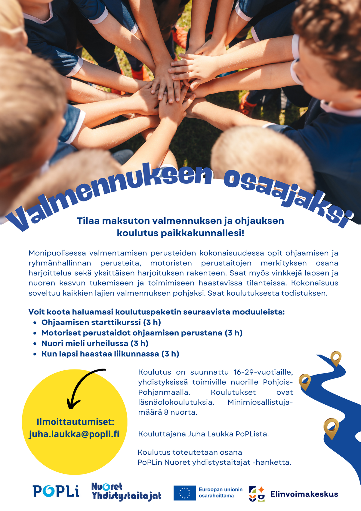 Kokoa 16-29-vuotiaista nuorista minimissään kahdeksan hengen ryhmä ja ota yhteyttä seurakehittäjä Juha Laukkaan (etunimi.sukunimi@popli.fi), niin katsotaan koulutukselle sopiva ajankohta.