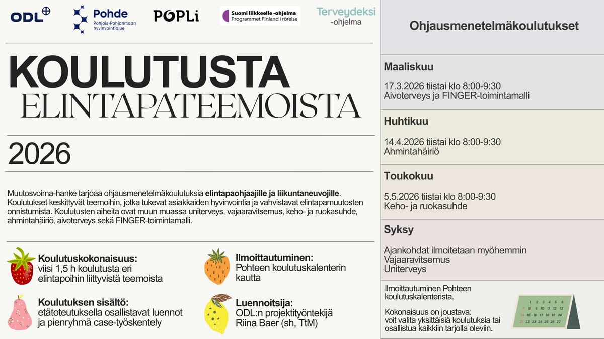 Koulutukset on suunnattu Pohteen henkilöstölle, jotka työssään osallistuvat elintapaohjaukseen. Tarkempaa lisätietoa koulutusten sisällöstä löytyy koulutuskalenterista.